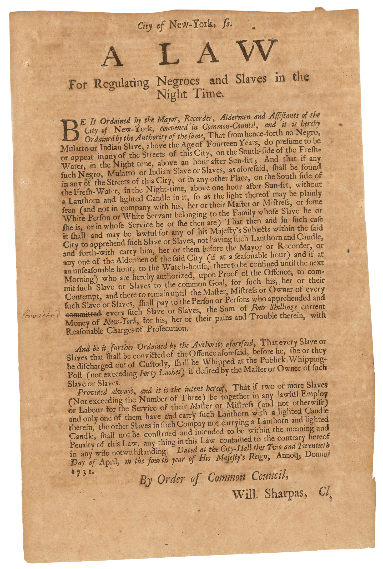 Rare Book Division, The New York Public Library, “A law for regulating Negroes and slaves in the night time.” New York Public Library Digital Collections. Accessed September 24, 2025. Early 18th-century recognition surveillance policy regulating the activity and movements of enslaved Africans. This document required “all Negroes, Mulattoes, or Indian slave above age fourteen” to carry a lantern at night so that their facial landmarks and form may be identified by policing officials. Image courtesy of The New York Public Library.