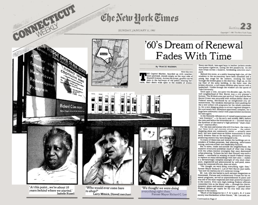 NY Times piece from Sunday, January 11, 1981, entitled “60'S DREAM OF RENEWAL FADES WITH TIME.” The article reflects on the state of urban decay in New Haven during the early 1980s and the promises of urban revitalization in the 1960s. https://www.nytimes.com/1981/01/11/nyregion/60-s-dream-of-renewal-fades-with-time-new-haven.html