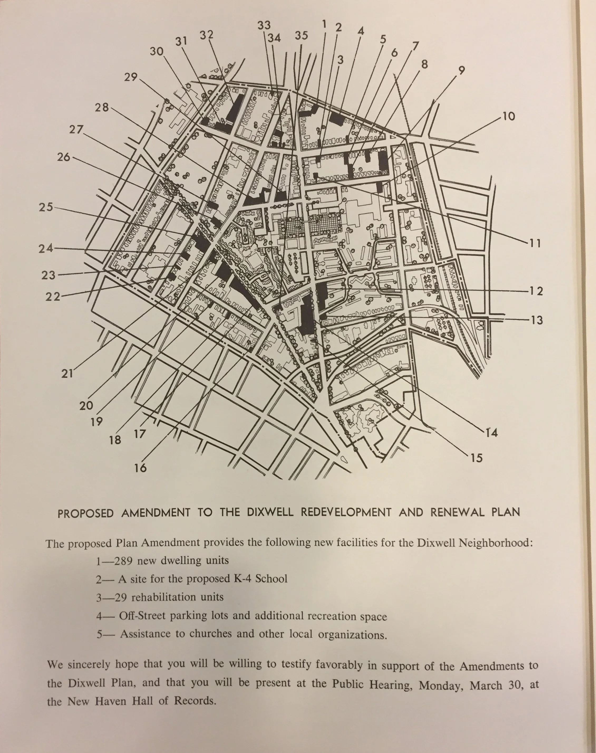 Proposed amendment to the Dixwell redevelopment and renewal plan. The proposed plan included affordable housing units, a business center, a school, and rehabilitation units. Image sourced from the New Haven Museum archives.